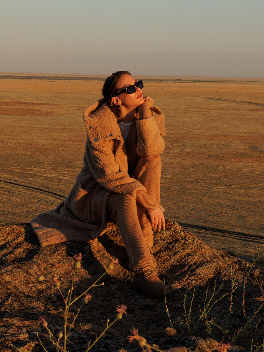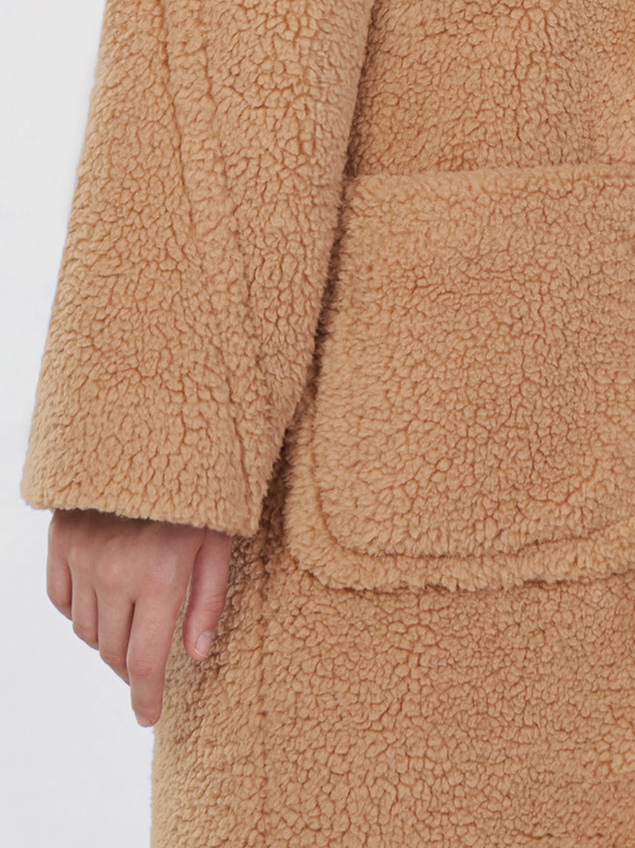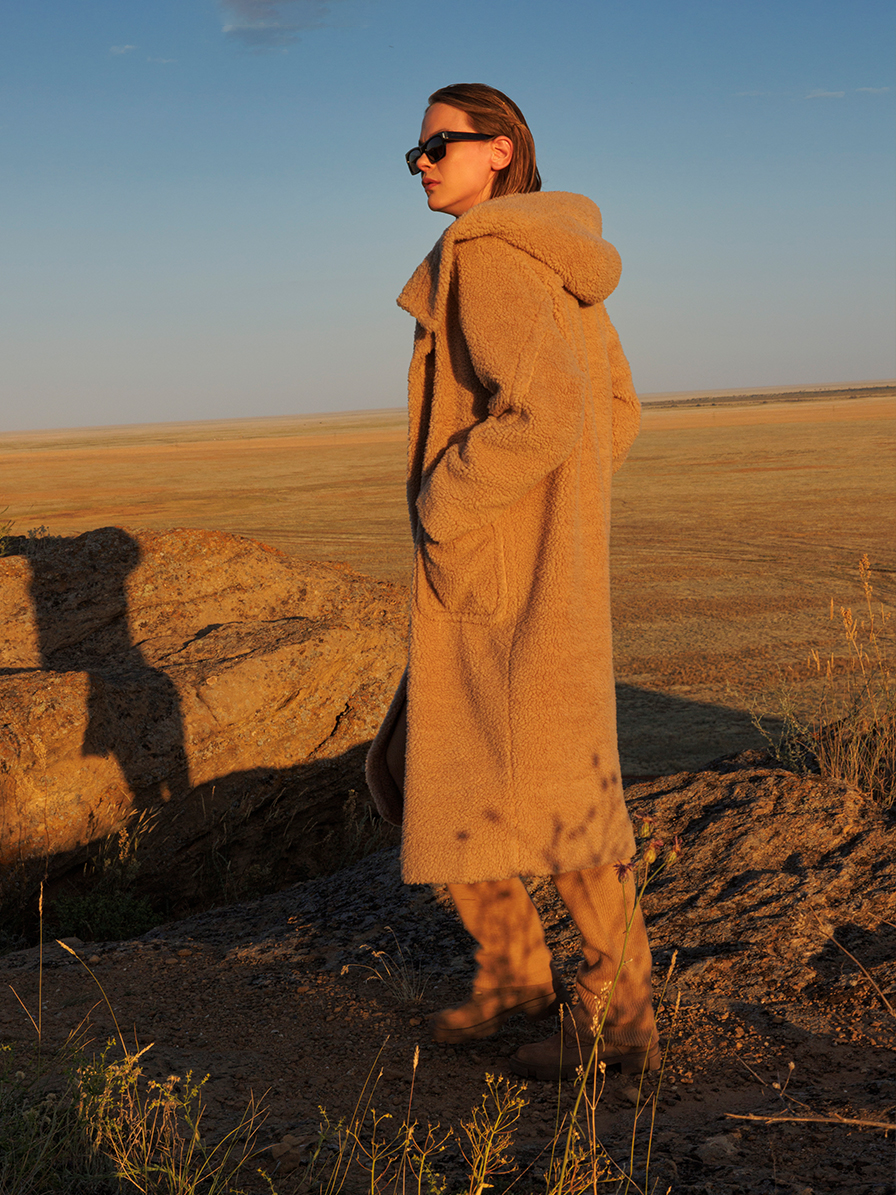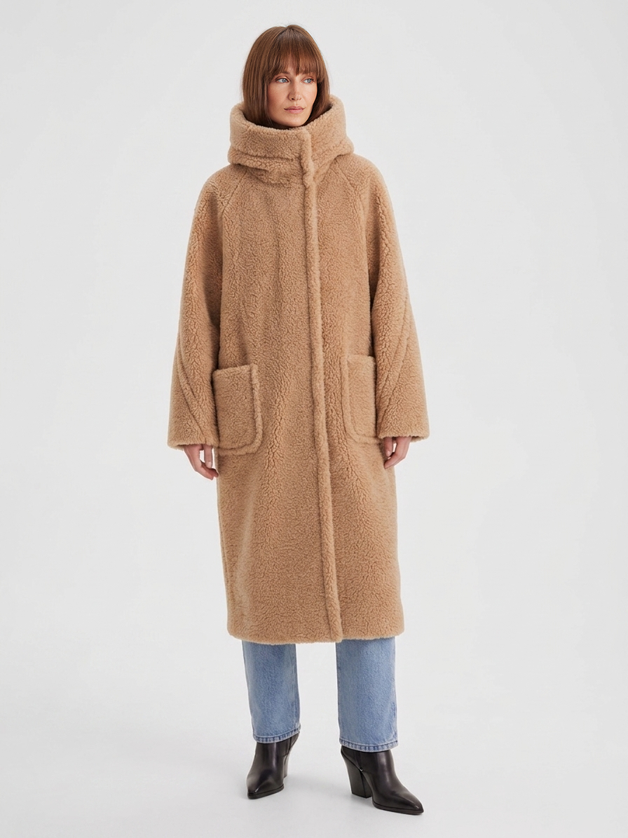 Пальто в стиле Teddy bear coat c воротником стойкой и несъемным капюшоном. Пальто носится, как оверсайз, но слегка заужено книзу. Реглан, переходящий в кокетку, также утончает руку, обвиваясь вокруг нее декоративным спойлером. Пальто застегивается на кнопки, которые закрыты планкой. Плотный экомех препятствует потери тепла, в таком пальто приятно гулять даже в прохладную промозглую погоду, спрятав руки в больших накладных карманах. Это удачная модная инвестиция, позволяющая сочетать множество образов: от городской элегантной леди в платье или брючном костюме, до демократичного стиля smart casual с водолазкой и кроссовками. Такое пальто давно стало must have любого гардероба в базовом молочном или коричнево-бежевом оттенках.