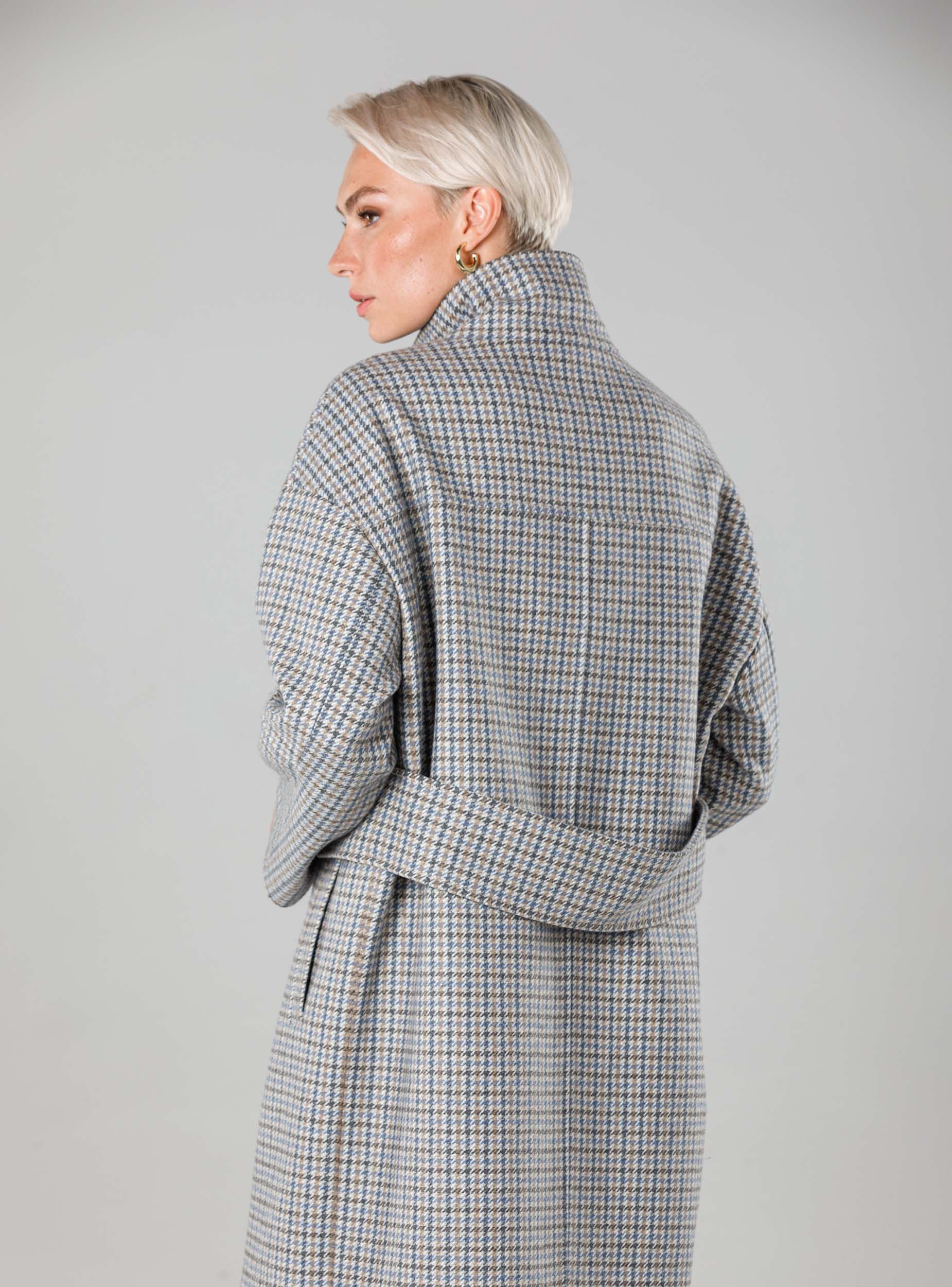 Великолепная двубортная модель с прямым силуэтом. Ее лаконичный изысканный образ создан за счет рубашечного рукава, с акцентом на патах и хлястике. Воротник-стойка дополнен магнитом. Хлястик, переходящий со спинки на полочку, визуально сужает талию и вытягивает фигуру. Карманы - листочки под наклоном зрительно скрадывают бедра. Важную роль в создании модного облика играет благородная ткань с высоким содержанием шерсти. Материал с фактурной поверхностью диагональ плотная и тёплая, но очень пластичная - уютно обволакивает, создавая выразительный образ.