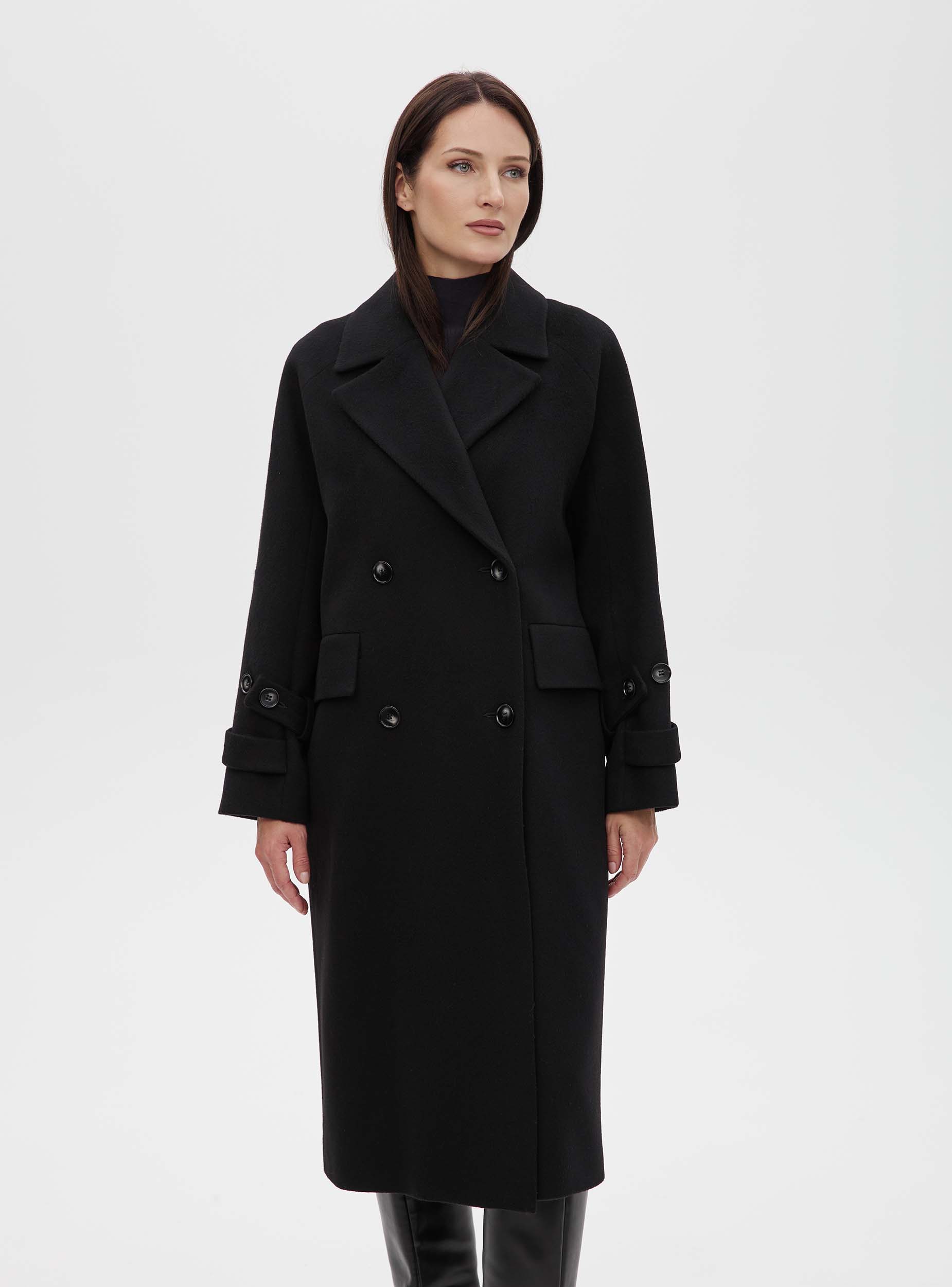 Двубортное женское пальто прямого силуэта из шерстяной ткани премиального качества. Пальто умеренного объёма, длина изделия до середины икры, что делает данную модель универсальной. Пальто хорошо сочетается как с брюками, так и с юбкой. Рукав трёхшовный оригинального кроя: верхняя часть - реглан, а нижняя - по конструкции втачного рукава. Такой крой позволяет сохранить комфорт посадки рукава реглан, при этом форма рукава выглядит более аккуратной и правильной. На рукаве есть круговая пата, позволяющая регулировать ширину рукава внизу. Благодаря гармоничному соотношению объёма и длины изделия пальто выглядит стильно и долго не будет терять своей актуальности.