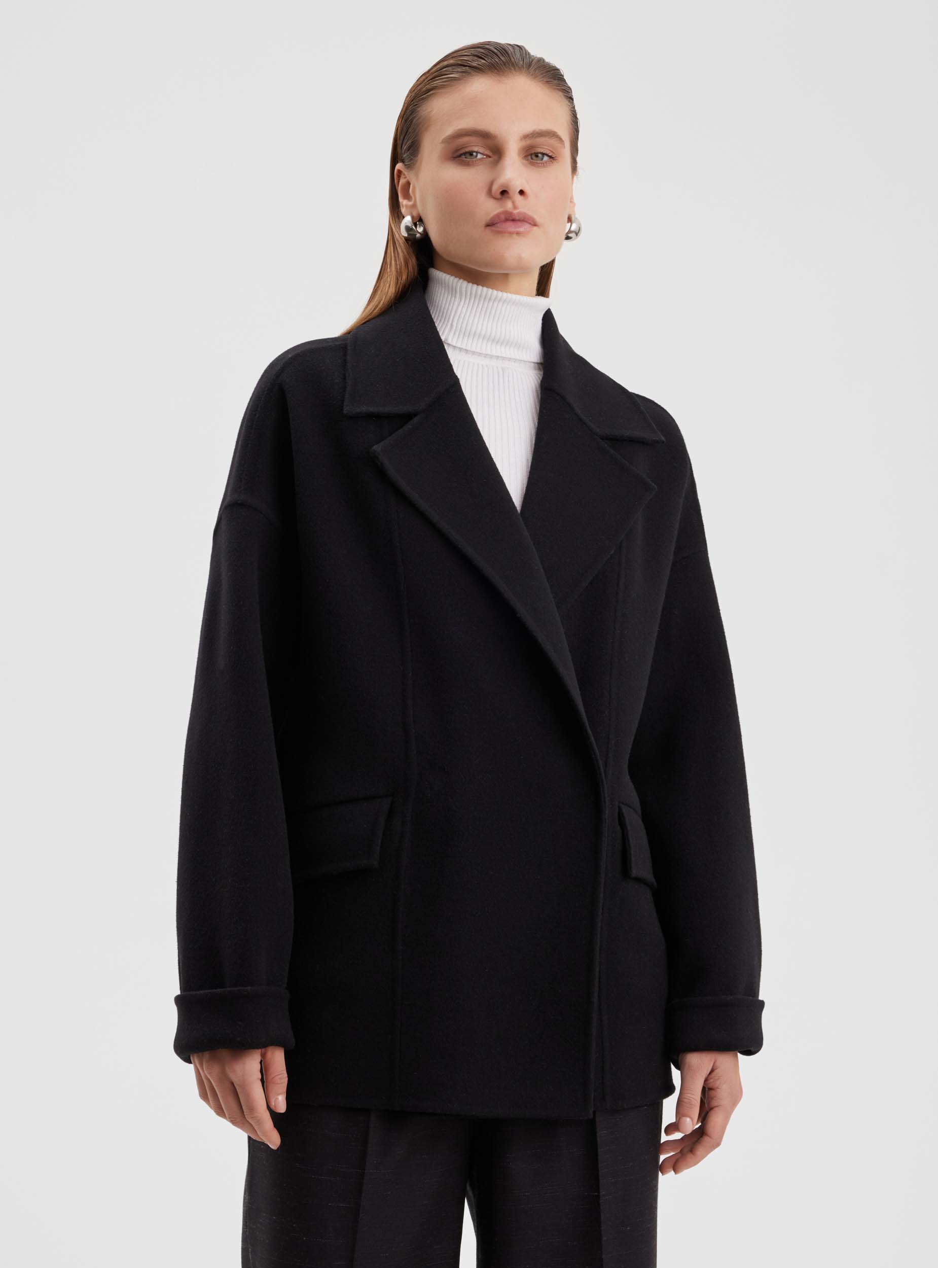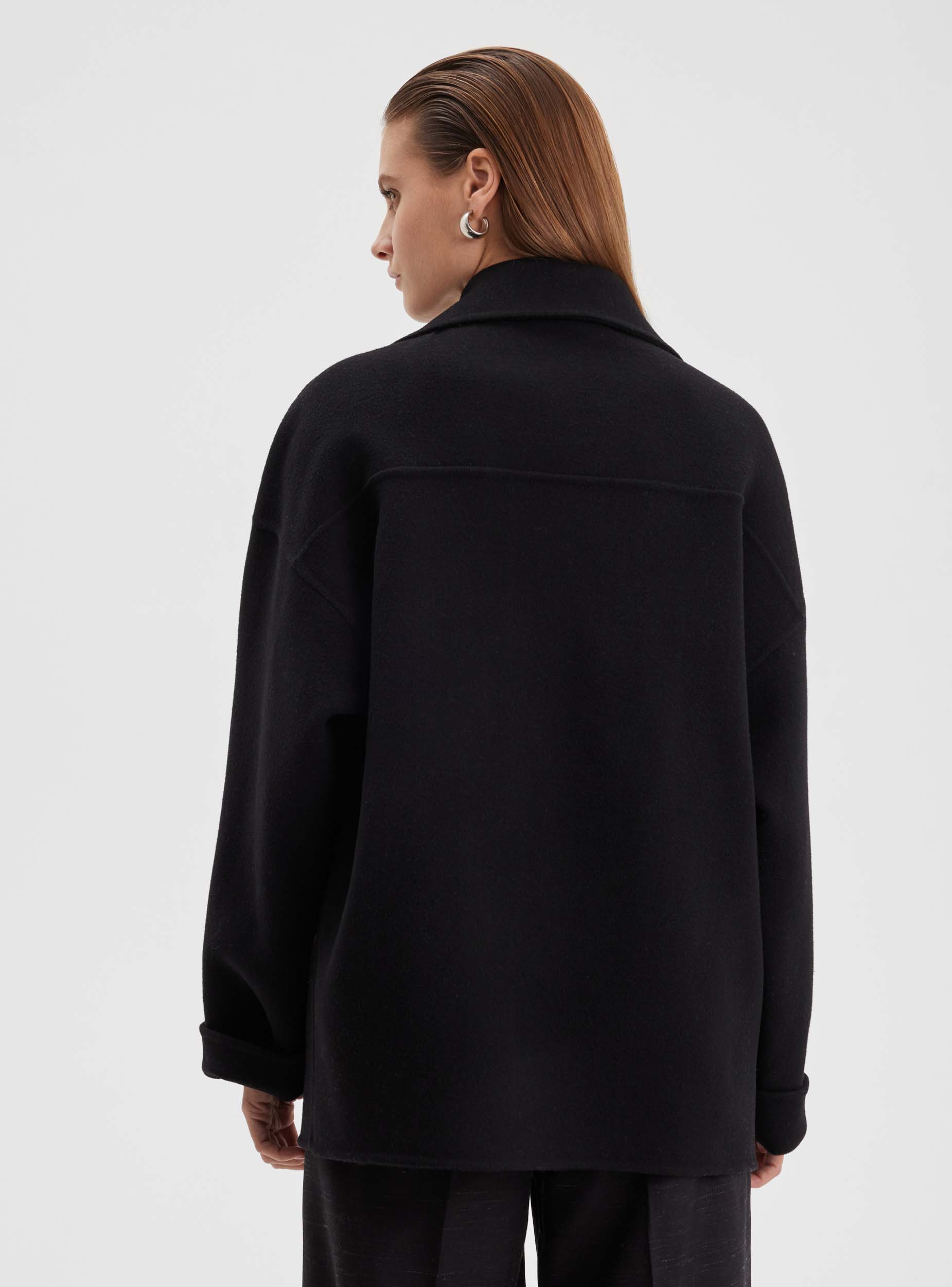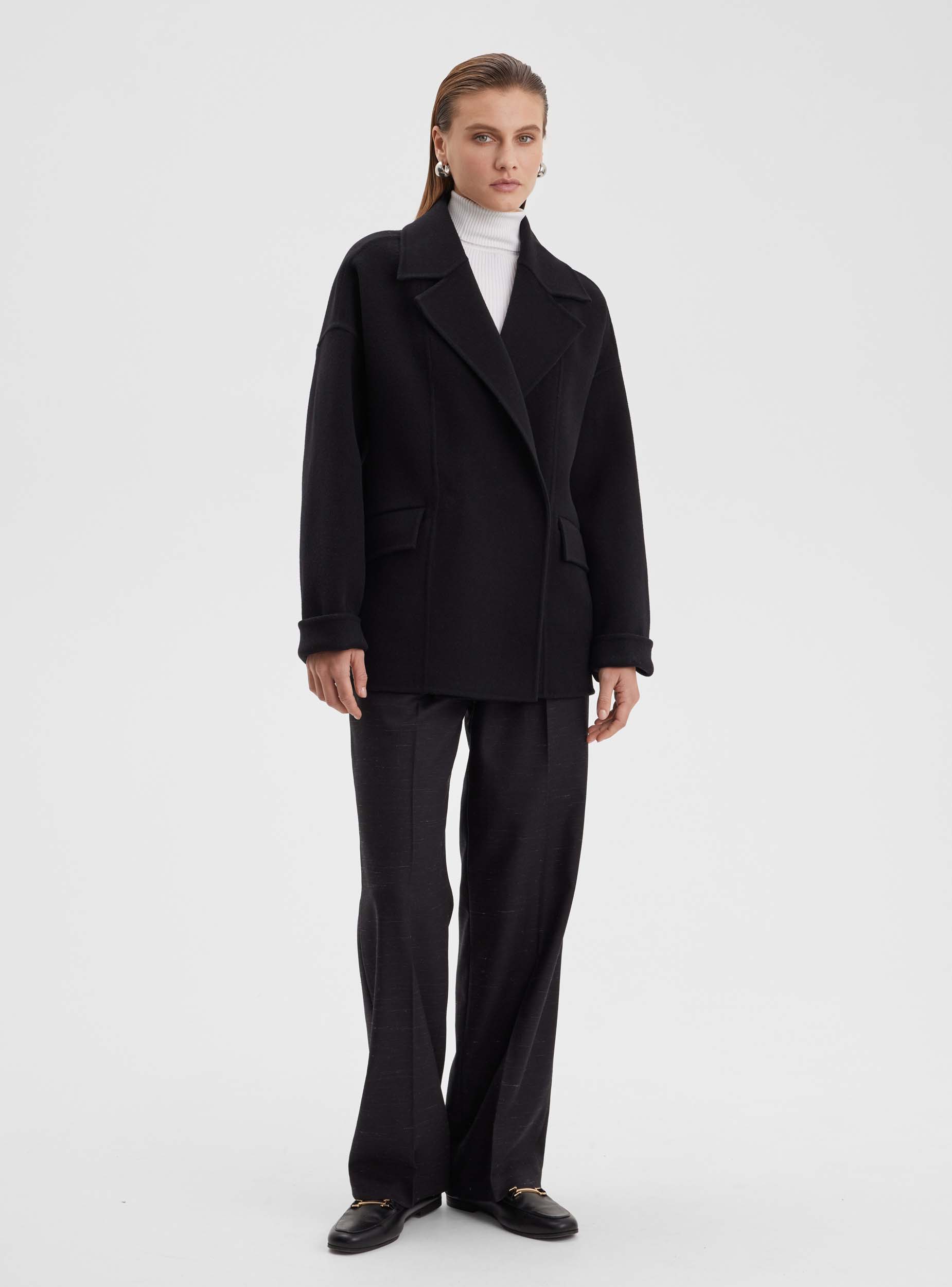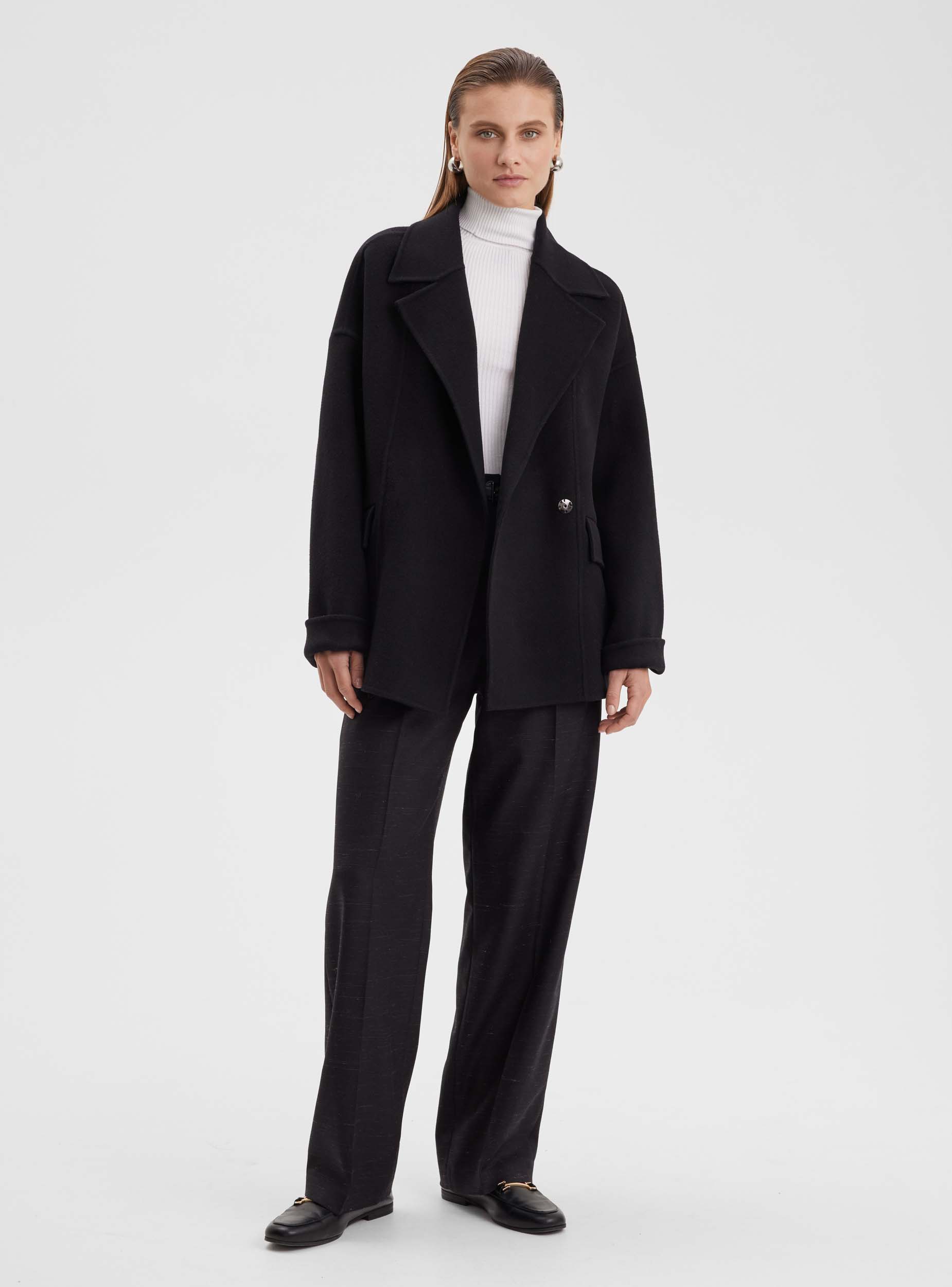 Пальто-жакет из шерстяной ткани премиального качества. Укороченное пальто-жакет свободного слиуэта. Английский воротник, спущенное плечо, рубашечный рукав, который можно стильно подвернуть. Карман наклонный в листочку с клапанами. Строгость линий и лаконичность деталей создают стильный образ, что дает возможность комбинировать жакет не только с деловым костюмом, брюками или юбкой, но и с джинсами. Жакет отлично сочетается как с классической обувью - сапогами и ботильонами, так и со спортивными кроссовками и грубыми ботинками.