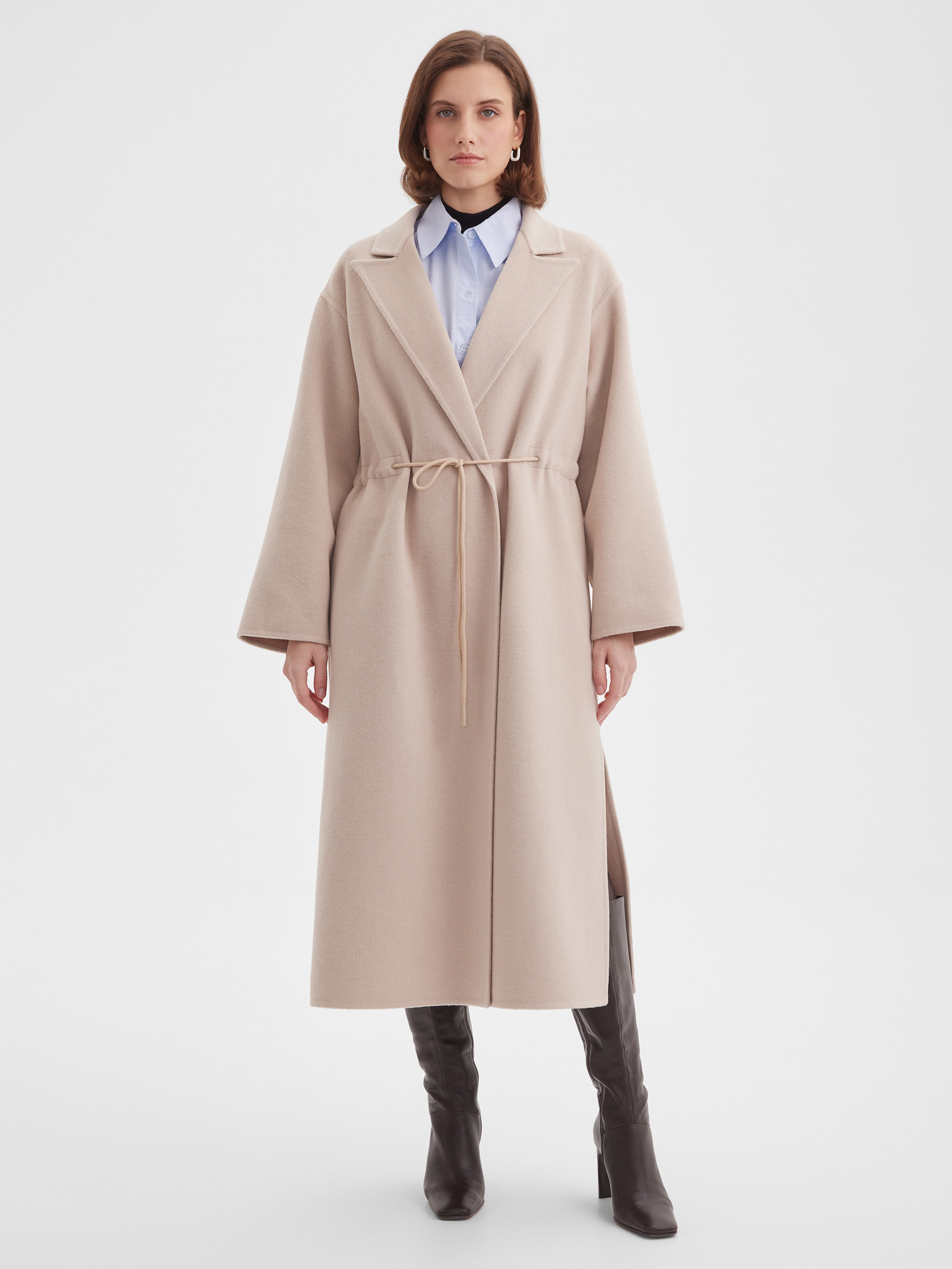 Пальто из двухслойной шерстяной ткани (100% ) — лёгкое, но тёплое. Модель без подкладки, со спущенным плечом и кулиской, формирующей талию. Английский воротник добавляет выразительности, а скрытые карманы в боковых швах и разрезы по бокам делают образ функциональным и современным.